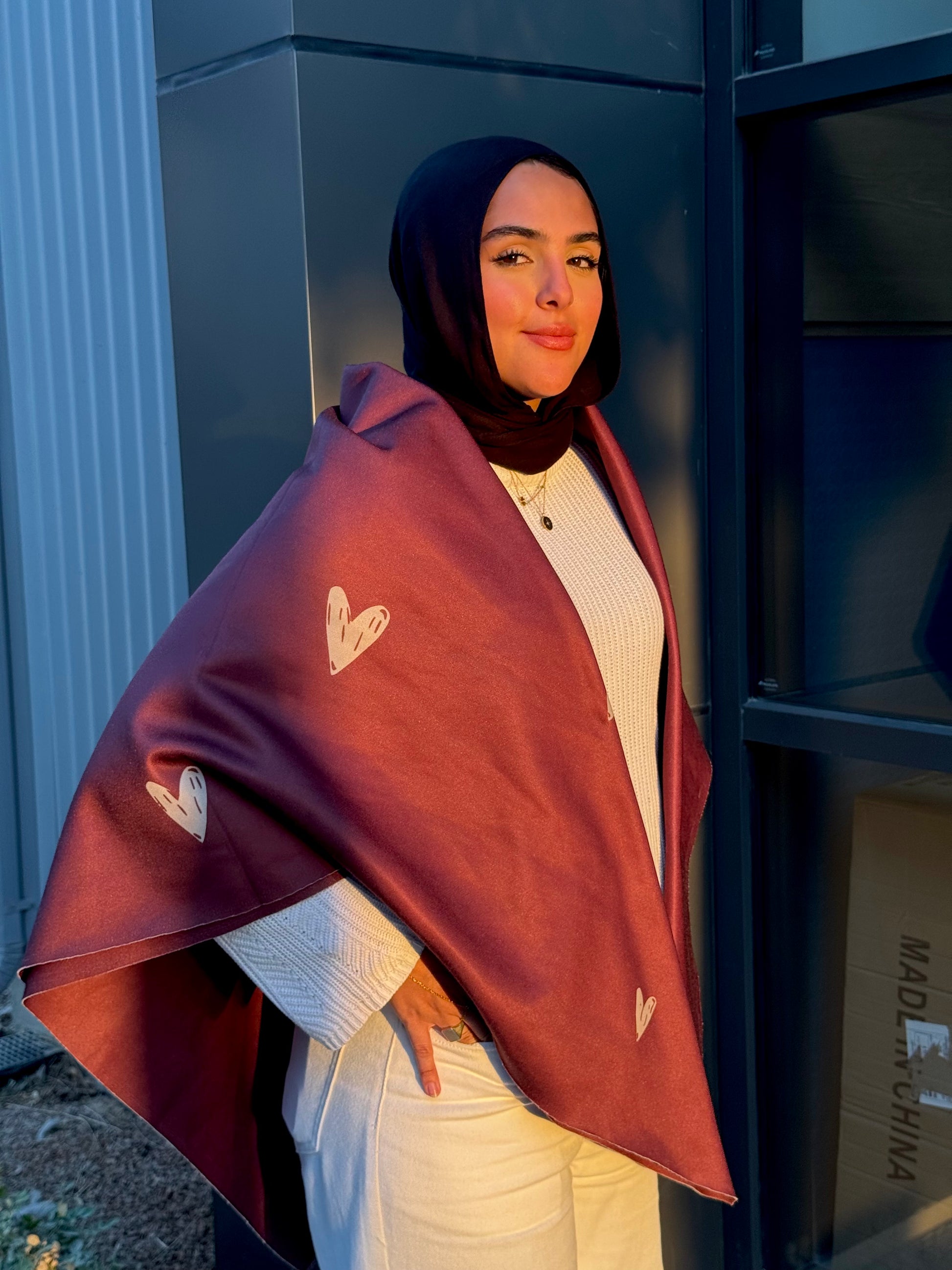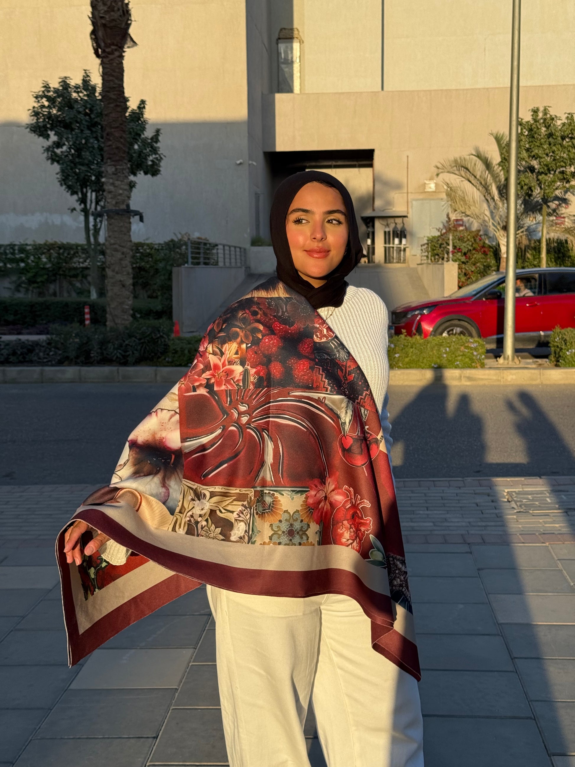 A rich burgundy scarf with an artistic, vintage-inspired print. Soft, elegant, and timeless—designed to add warmth, depth, and effortless sophistication to any look.